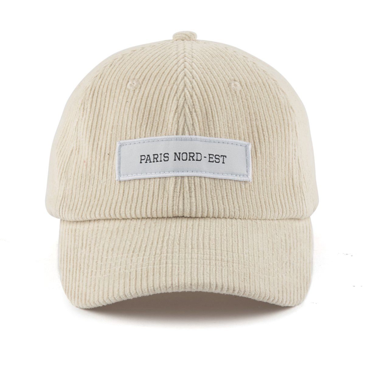 Casquette sans structure, 6 panneaux, en velours côtelé 100% coton avec bandeau de sudation, sangle de serrage, boucle métallique et passant.