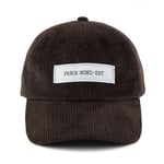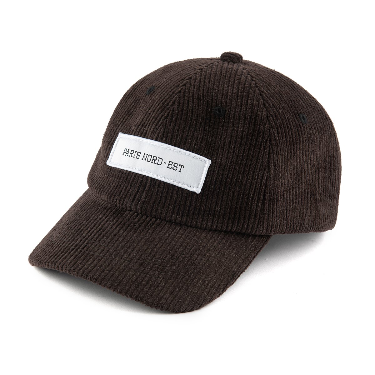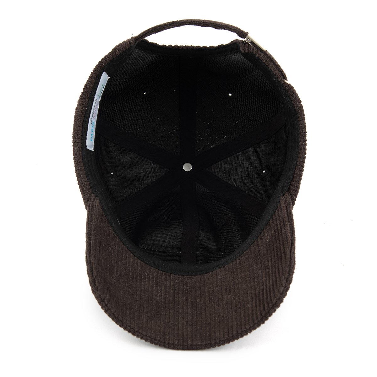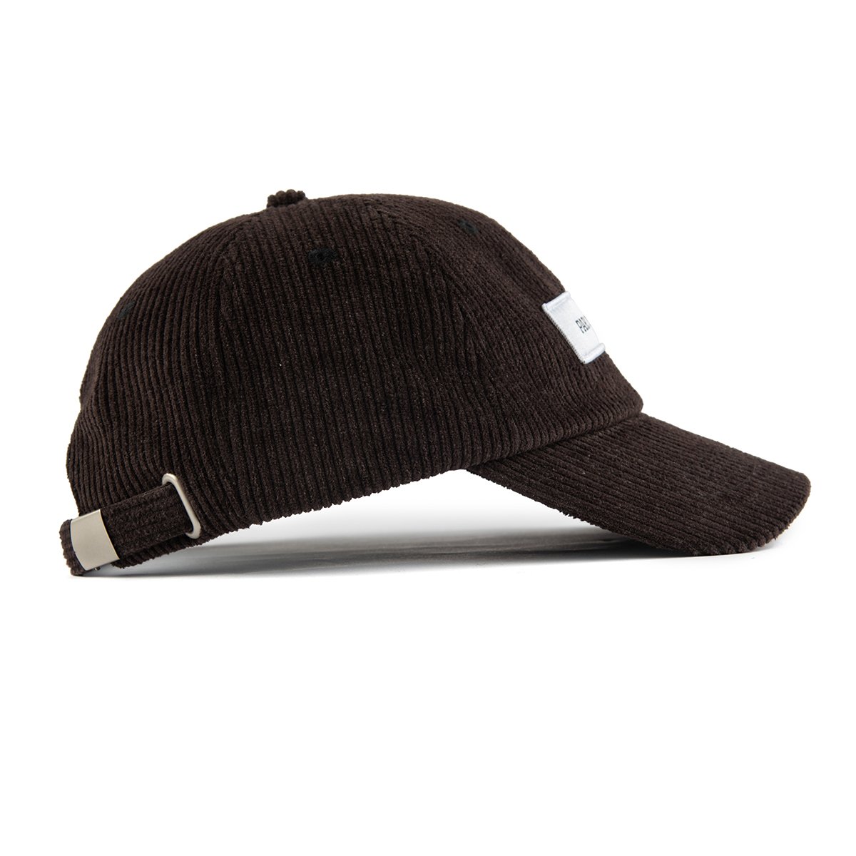 Casquette sans structure, 6 panneaux, en velours côtelé 100% coton avec bandeau de sudation, sangle de serrage, boucle métallique et passant.
