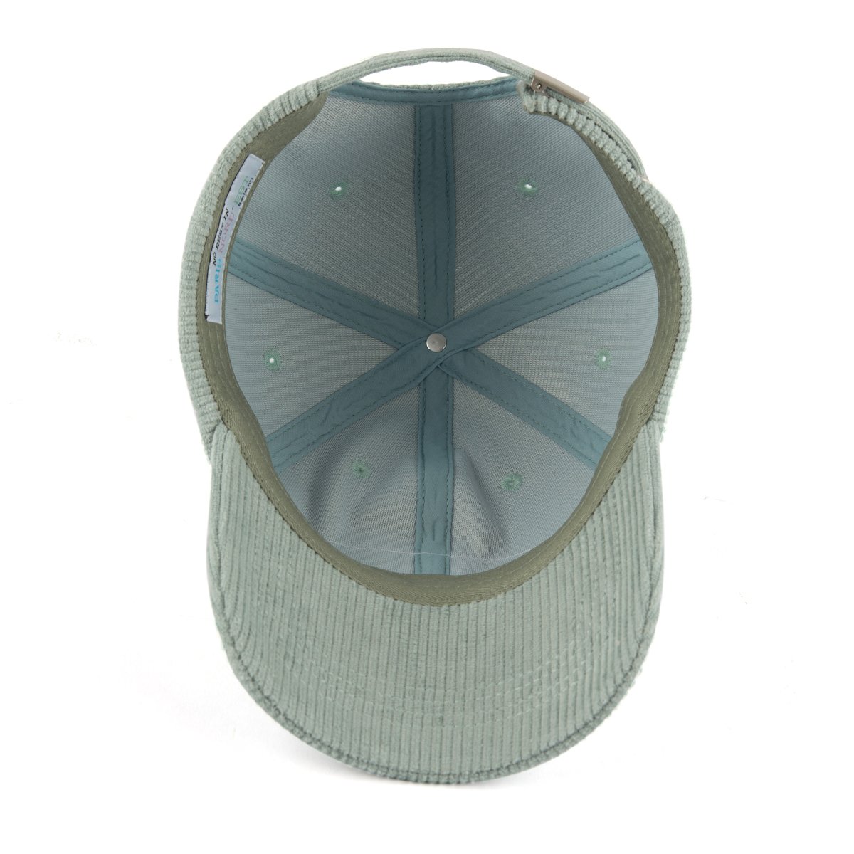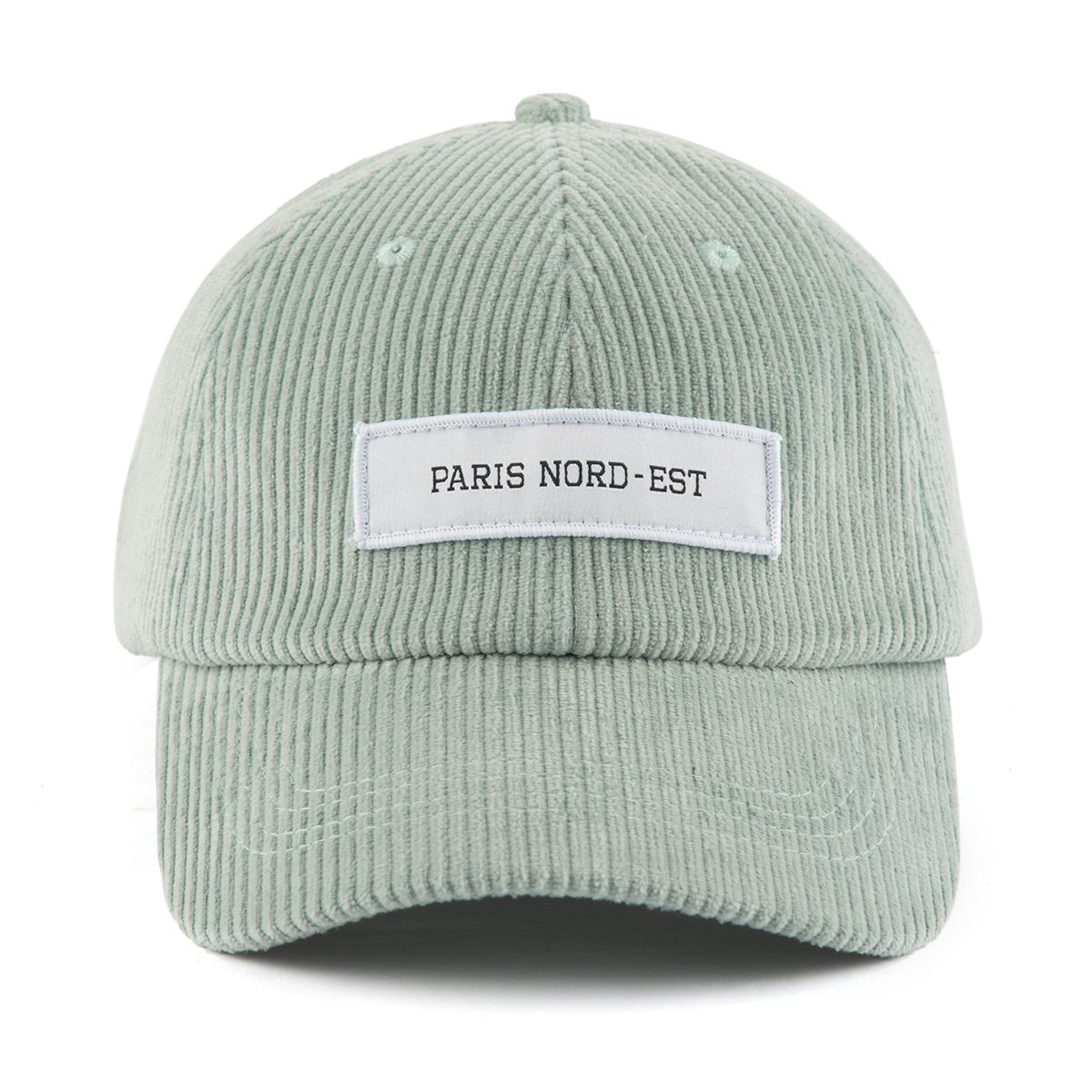 Casquette sans structure, 6 panneaux, en velours côtelé 100% coton avec bandeau de sudation, sangle de serrage, boucle métallique et passant.